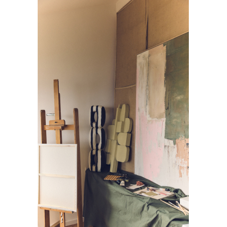 Abstraktní obraz NOMAD na lněném plátně od HK LIVING. Malba sestává z abstraktních barevných skvrn v neutrálních tónech jako šedá, béžová, zelená a krémová na neutrálním pozadí. Obsahuje háčky pro umístění kolíků podle typu stěny.