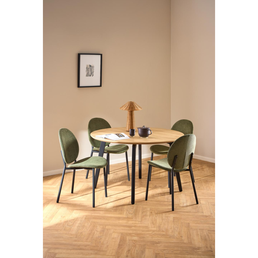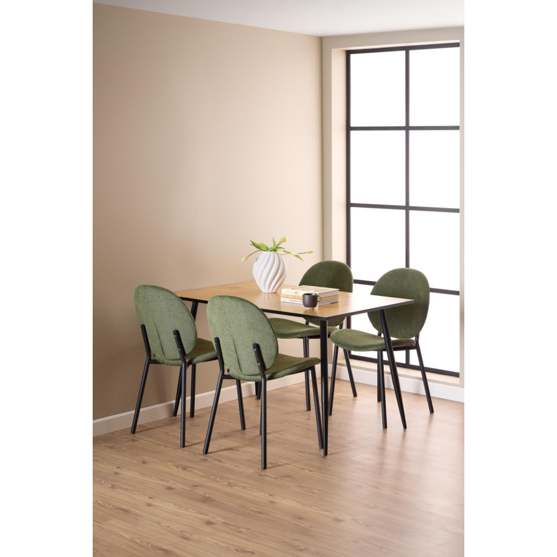 Výrazná jídelní židle s odkrytým ocelovým rámem s černým práškovým nástřikem. Černý ocelový rám se skládá z kulatého sedáku a opěradla a vytváří jemný kontrast, který umocňuje moderní estetiku židle. Dobře se integruje do různých interiérových stylů.