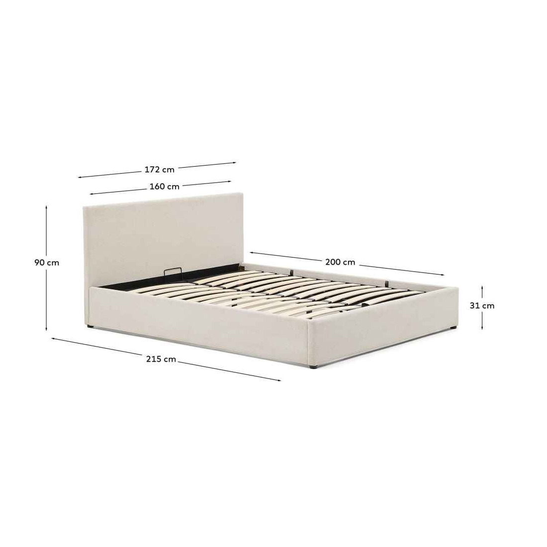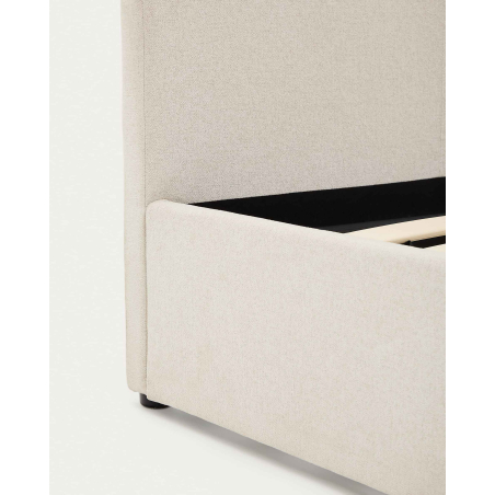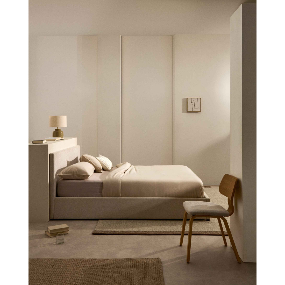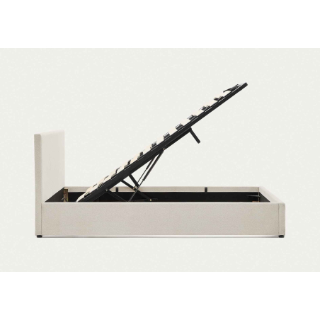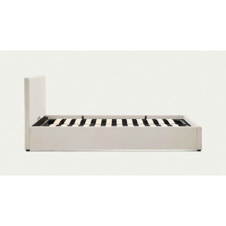 Béžová čalouněná postel NAHIRI se sklápěcím roštem a úložným prostorem. Měkká žinylková tkanina s povrchovou úpravou pro snadné čištění. Tato čalouněná postel kombinuje design a funkčnost a nabízí pohodlný spánek a více úložného prostoru bez kompromisů ve stylu. Má výklopný rošt a díky plynovému pístovému mechanismu umožňuje snadný a snadný přístup do úložného prostoru. Je navržen tak, aby se vešel do každé ložnice a obsahuje plastové chrániče nohou, které zabraňují poškození podlahy a poskytují větší stabilitu. Praktické a elegantní řešení, které optimalizuje prostor bez kompromisů v designu.
