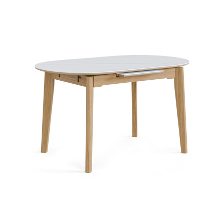 Stůl VELMA vyniká elegantní kombinací materiálů a funkčnosti. Má porcelánový talíř v travertinové barvě a dřevěná dýha poskytuje sofistikovaný a odolný povrch, který je ideální pro každodenní použití, zatímco přírodní dřevěné nohy dodávají teplo a stabilitu. Je oválný a lehký, je vybaven rozšiřitelným systémem, který se pohybuje od 140 do 180 cm a snadno se přizpůsobí různým okamžikům, od malých večeří až po setkání s více hosty. VELMA je univerzální, praktický stůl s nadčasovým stylem, ideální pro moderní jídelny nebo severské prostory.