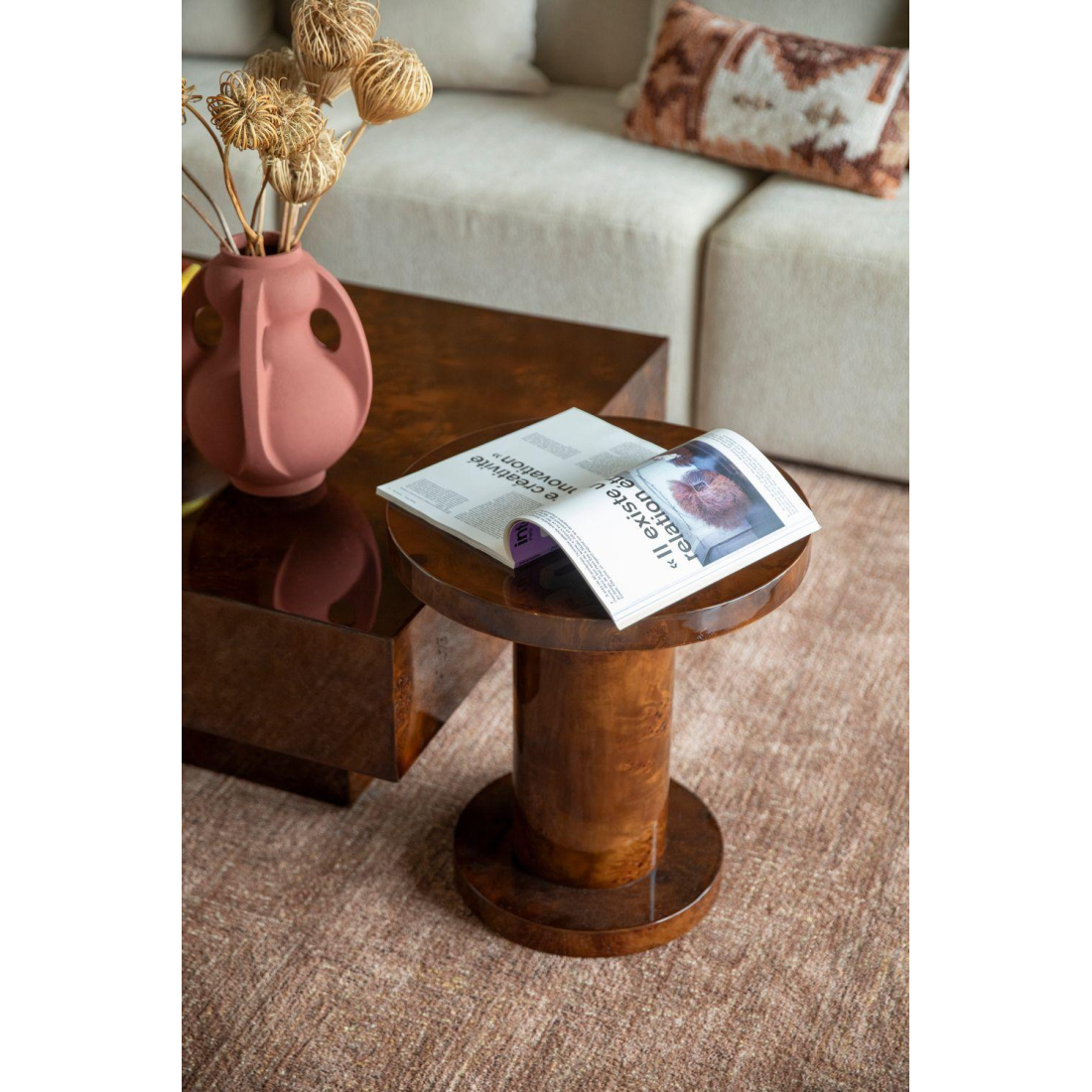 Designový stůl QUINN z bukového dřeva v lesklém provedení. Do interiéru vnáší atmosféru 70. let. Díky svému výraznému tvaru a jedinečnému zrnitému dřevěnému dýhovému vzoru vás tento nápadný stůl okamžitě vrátí v čase. V kombinaci s vysoce lesklým povrchem dodává výstřední nádech.