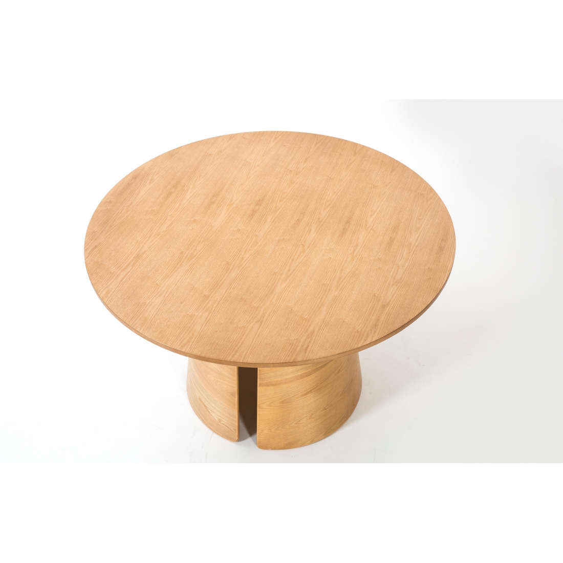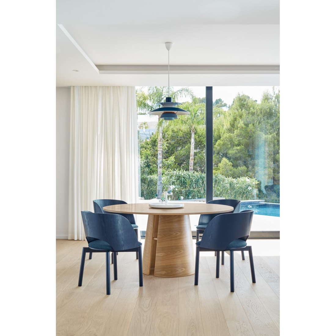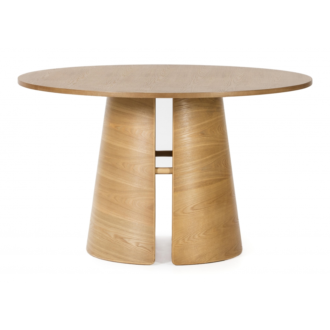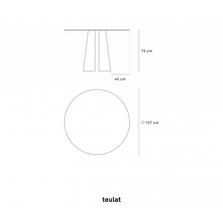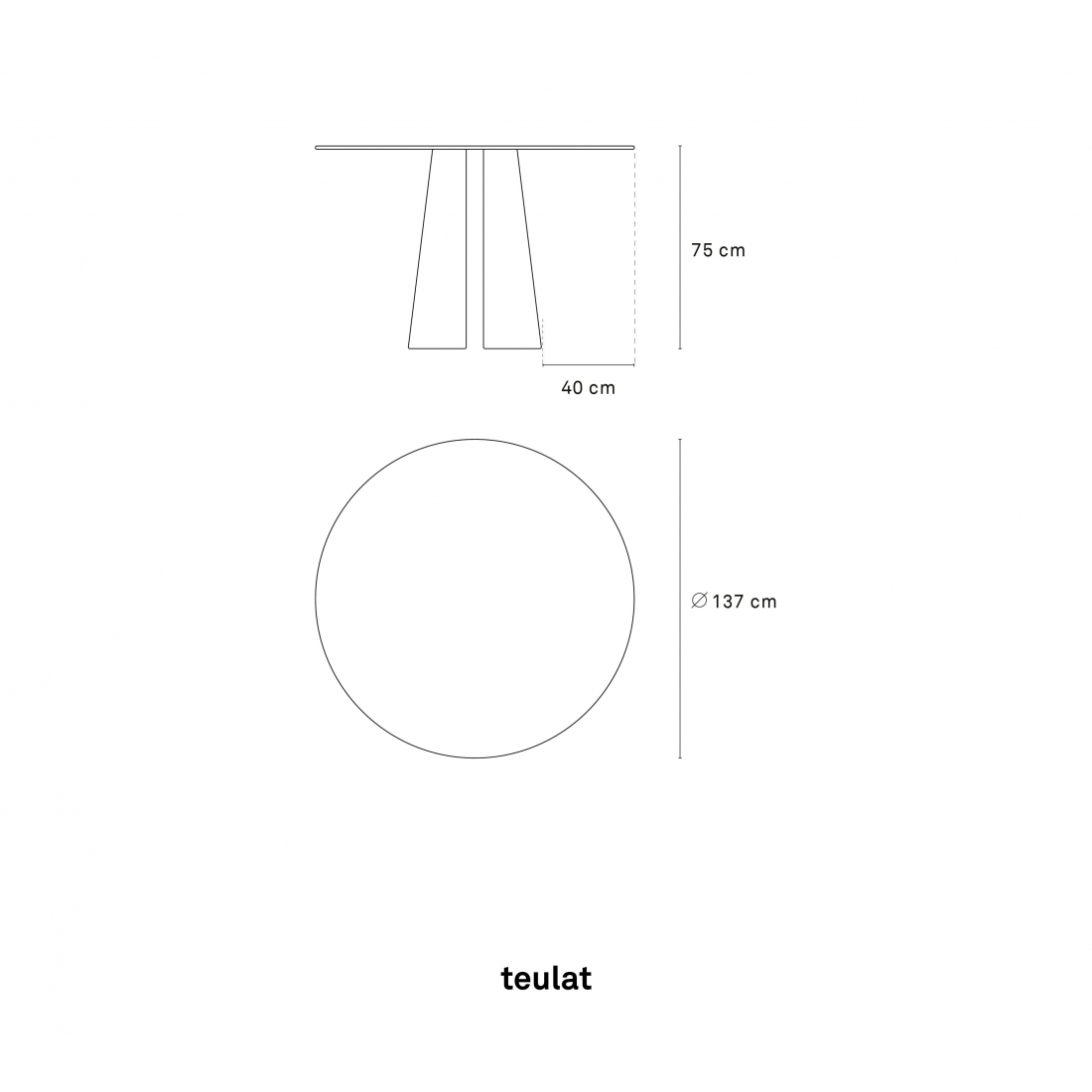 Kulatý stůl Teulat CEP je určen pro náročné uživatele, kteří si potrpí na originální design. Vrchní a nohy jsou dýhované přírodním nebo běleným dubem nebo jasanovým dřevem mořeným černě. Tloušťka vrchní desky: 18 mm. Nohy: Kaučuková překližka. Čistit vlhkým hadříkem nebo houbou, nepoužívat agresivní a abrazivní čističe.