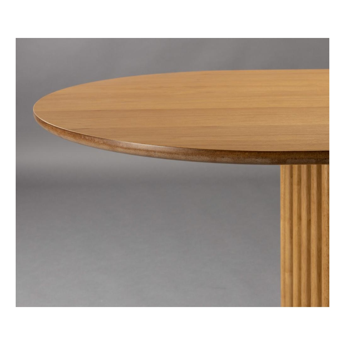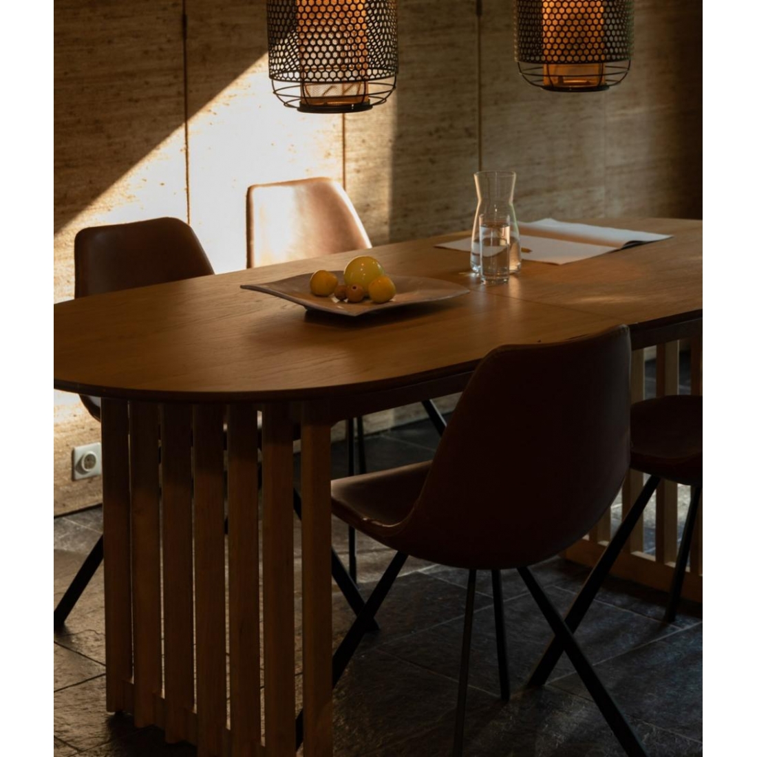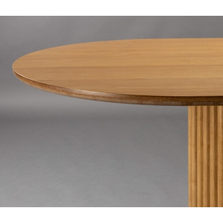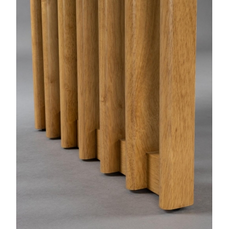 Designový stůl se stolovou deskou z dubové nebo ořechové dýhy s vrchním PU lakem. Odkrytý okraj MDF na tmavě mořený. Oblé tvary dodávají elegantní nádech, který spolu s dřevěnou dýhou vytváří hřejivou atmosféru. Co ovšem upoutá pozornost, je samozřejmě nápadná základna s různými dřevěnými lamelami. Je to zkrátka dokonalý kus nábytku, který přemění jídelnu...