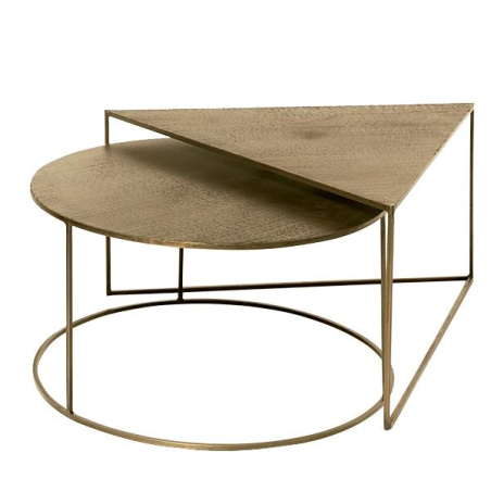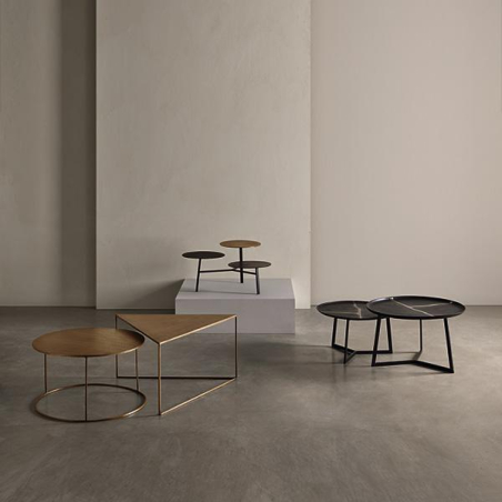Sada 3 konferenčních stolků v minimalistickém stylu. Stolky jsou vyrobeny z hliníku v odstínech zlaté a černé barvy s jedinečným a inovativním designem a zaoblenou povrchovou úpravou, díky které svou originalitou upoutají pozornost kdekoli.