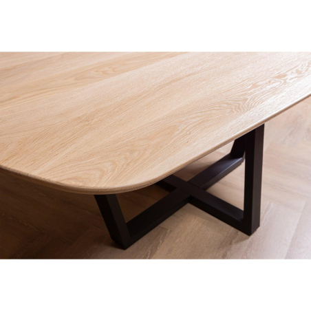 Designový jídelní stůl TABLO s dubovým topem v přírodní barvě a kovovými nohami. Deska stolu je vyrobena z FSC mix certifikovaných lepených dubových proužků s průběžným lamelovým kloubem, který vytváří příjemný tichý motiv. Dub se vyznačuje jasně viditelným zrnitým vzorem. Přirozené nedokonalosti dubu dělají každý stůl jedinečným. Deska je jemně broušená, což zvýrazňuje stopy zrna a dále zvýrazňuje skvrnové barvy, má měkké zaoblené hrany, což vytváří rafinovaný a elegantní vzhled. Noha stolu je vyrobena z kovu a zakončena černou práškovou barvou. Kov má různé povrchové úpravy, jako jsou: práškové lakování a starožitná mosaz. Práškový lak poskytuje luxusní matný vzhled a chrání kov po celý život. Prášková barva je lak, který je při vysokých teplotách připevněn ke kovu.