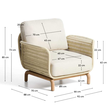 Křeslo ALIPA z masivního akátového dřeva má sedák ručně tkaný s lanem odolným proti UV záření, součástí balení jsou i pohodlné odnímatelné polštáře. Masivní akátové dřevo se vyznačuje jedinečným zrnem v každém kousku, které dodává charakter a nadčasový vzhled. Dřevo je také silné, odolné a toleruje vlhkost a mikroorganismy zvenčí. Pro zachování jeho vlastností doporučujeme aplikovat vhodný konzervační prostředek na dřevo alespoň jednou ročně. Použité dřevo je 100% FSC certifikováno, z odpovědně obhospodařovaných lesů. Polštáře se snadno čistí, ale doporučujeme je schovat v deštivých dnech, abyste prodloužili jejich trvanlivost. Lze kombinovat se zbytkem kolekce. Vhodné pro vnitřní i vnitřní venkovní použití.