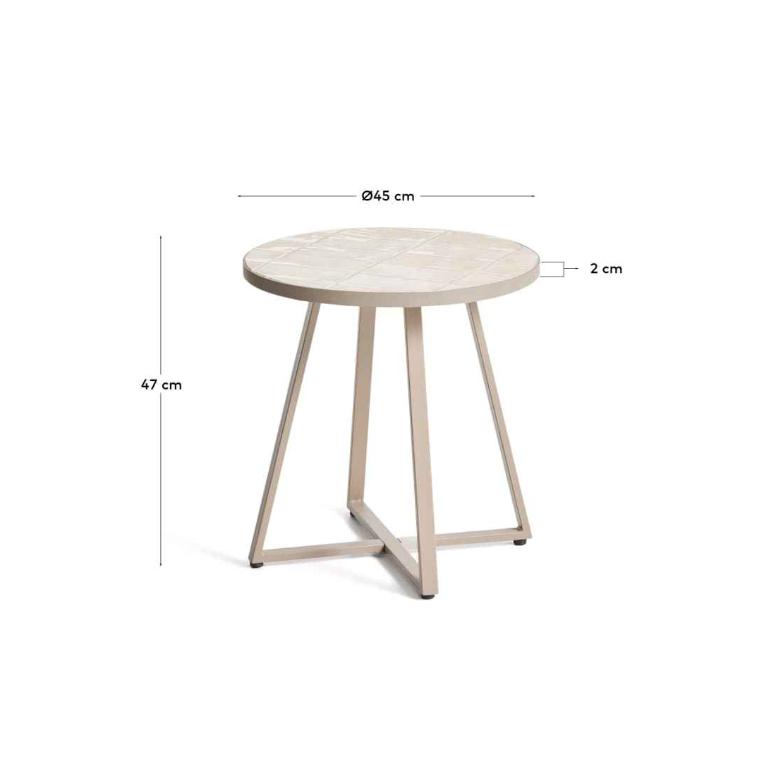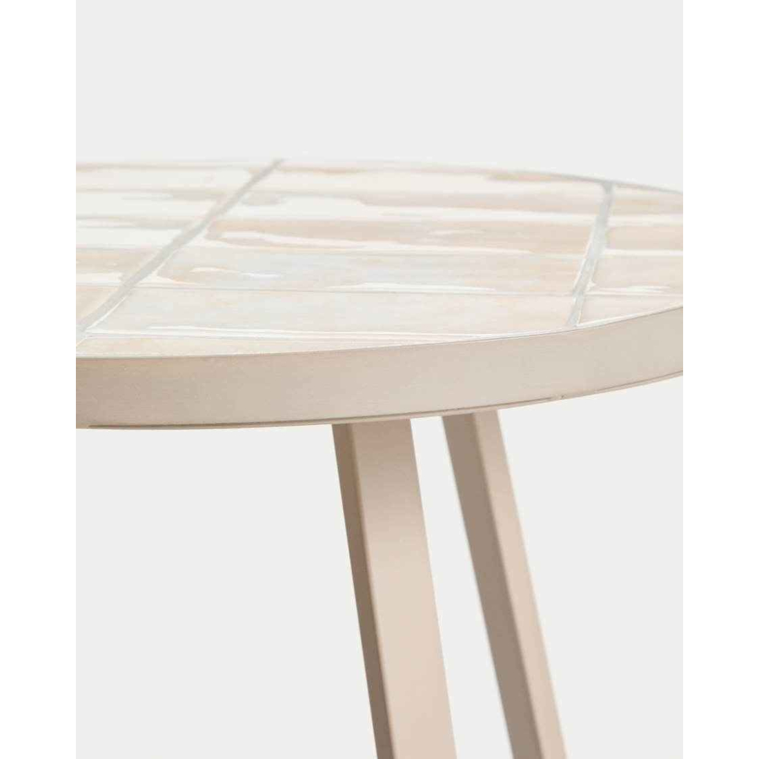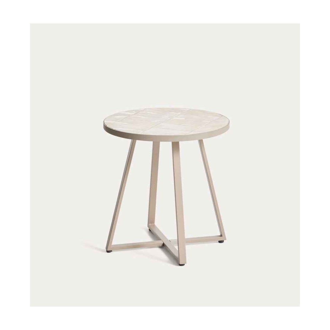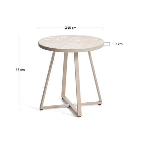 Ruční stolek Tella s kovovou konstrukcí, která má ručně skládané béžové dlaždice. Konstrukce, vyrobená z pozinkované oceli, nabízí vysokou odolnost proti korozi a korozi. Jeho nohy jsou vybaveny plastovými chrániči, které chrání podlahu a zlepšují stabilitu. Lze kombinovat se zbytkem kolekce. Vhodné pro vnitřní i venkovní prostory.