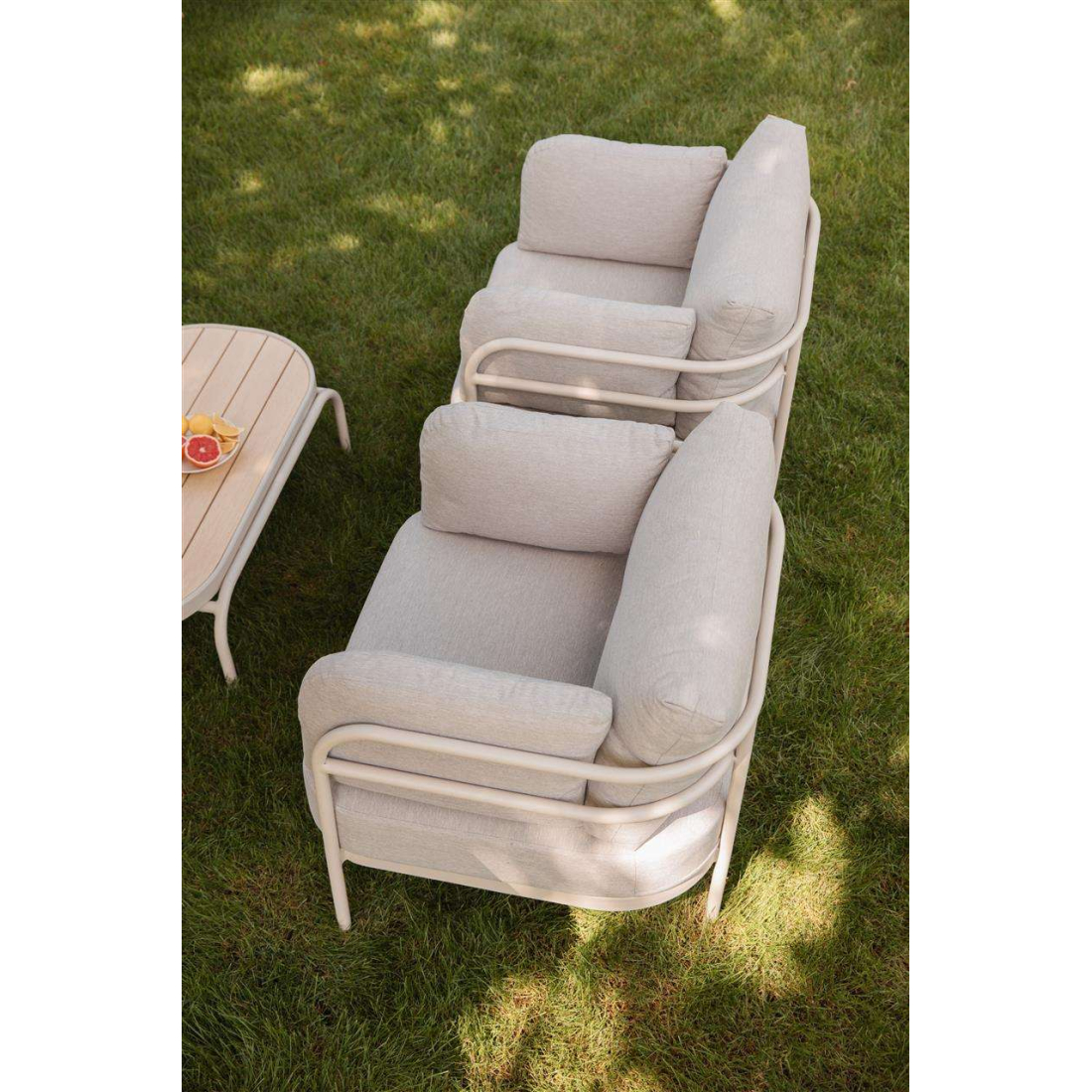 Hliníkový zahradní set pohovky a 2 křesel Vista. S modelem Vista snadno zvýšíte pohodlí svého venkovního prostoru. Velkorysé polštáře na sedáku a opěradle vám umožní pohodlně se opřít. Hliníkový rám s lehkým práškovým lakováním, doplněný pohodlnými polštáři na sezení, čalouněnými vodoodpudivou olefinovou tkaninou. Vhodné do vnitřních a venkovních prostor.