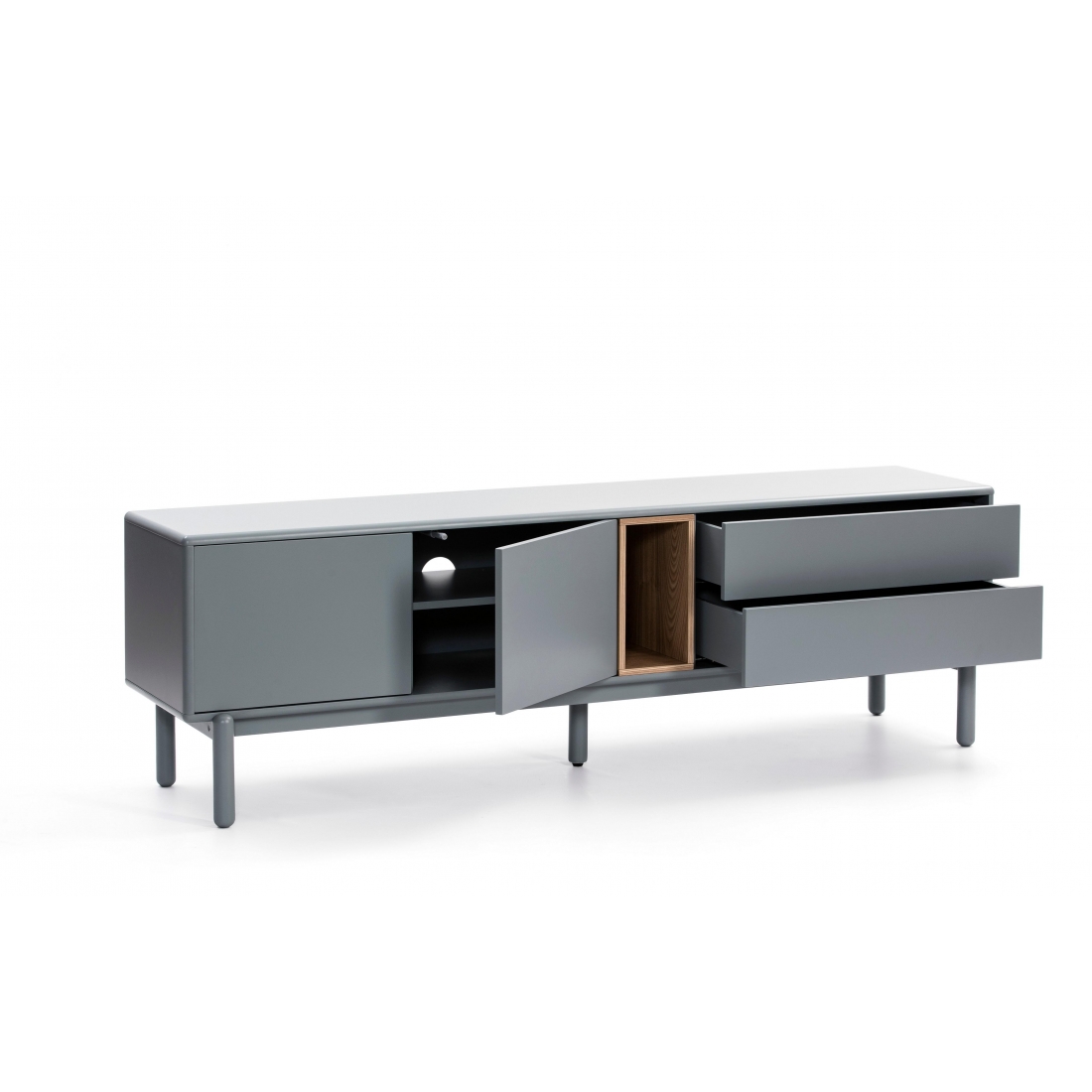 Zaoblené hrany po celém obvodu nábytku dodávají kolekci Corvo jemný a objemný vzhled. TV stolek Corvo je vyroben z lakované MDF kromě výklenku, který má povrchovou úpravu z dýhovaného dubu. TVstolek Corvo má jedny dvířka, čtyři zásuvky a vertikální výklenek. To nabízí širokou škálu možností ukládání. Čistit vlhkým hadříkem nebo houbou, nepoužívat agresivní a abrazivní čističe.