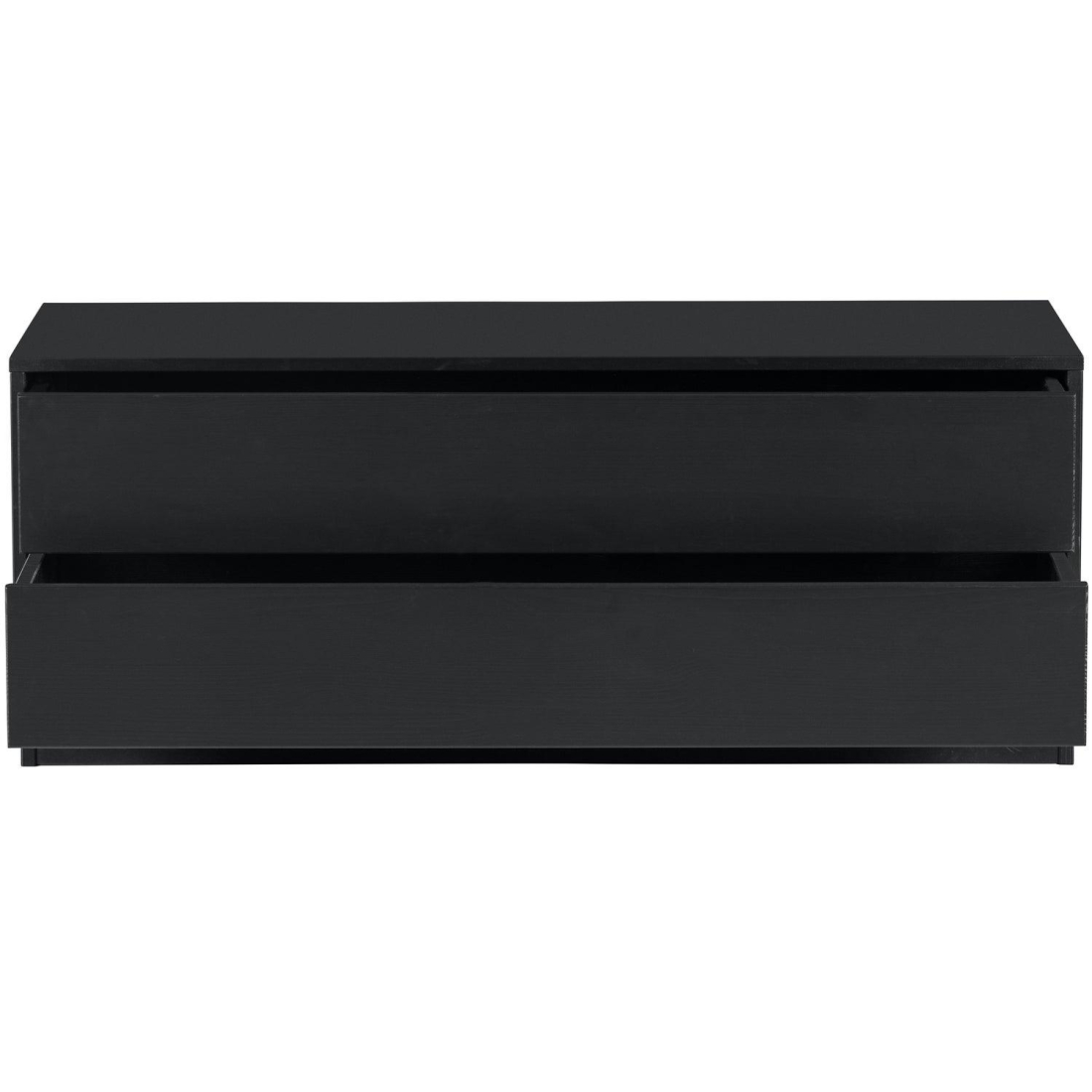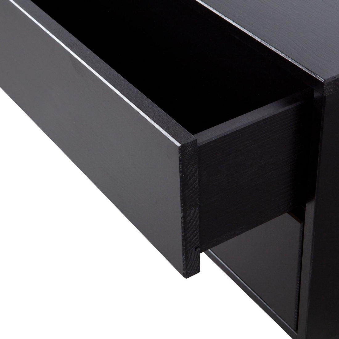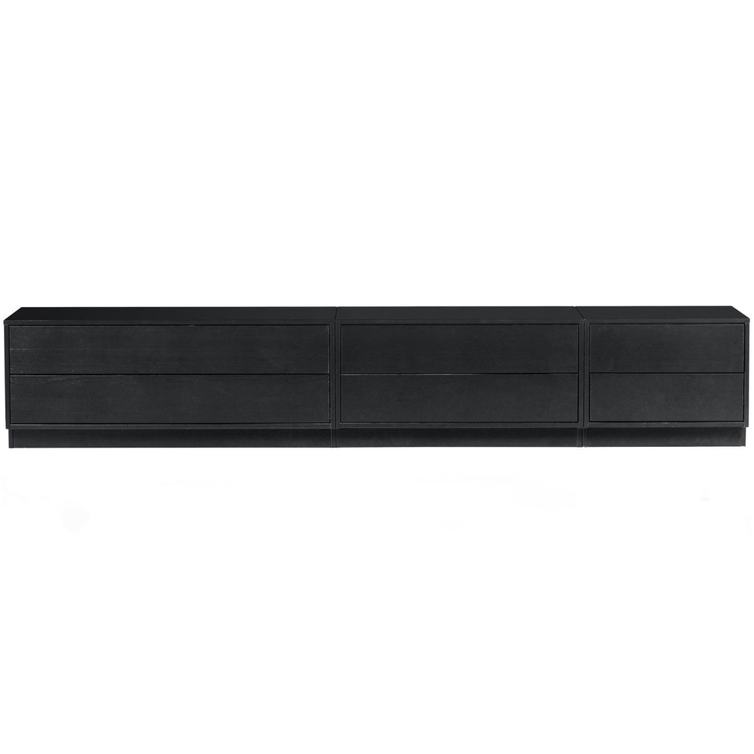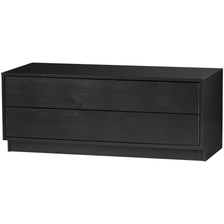Designový televizní stolek FINCA z masivního borového dřeva v černé barvě. Nábytek má matný povrch s tmavě černou barvou. Čisté linie nábytku Finca nejsou přerušeny klikami, moderní systém push-to-op umožňuje tiché otevírání a zavírání dveří a zásuvek.