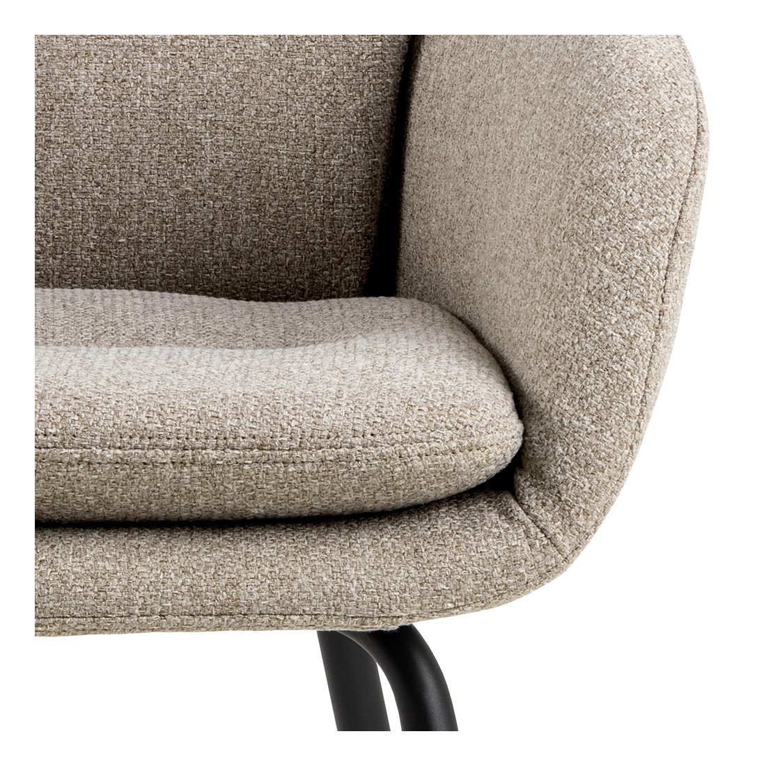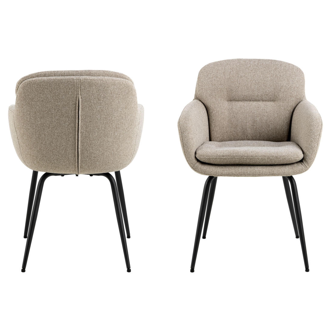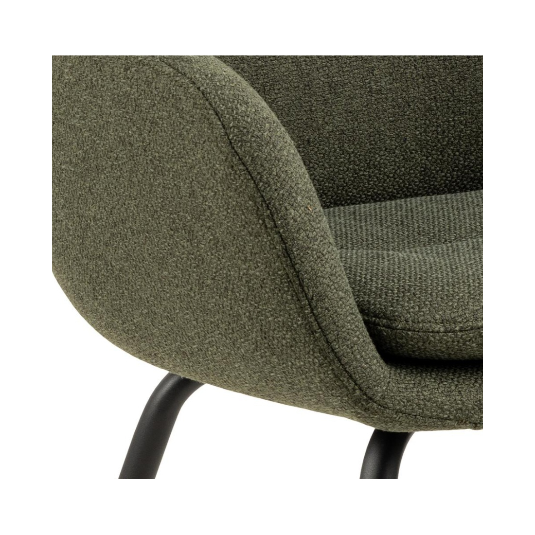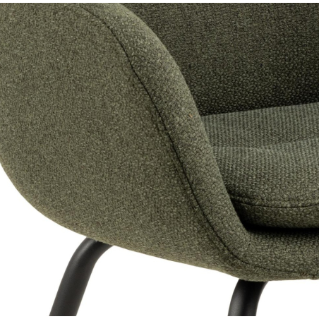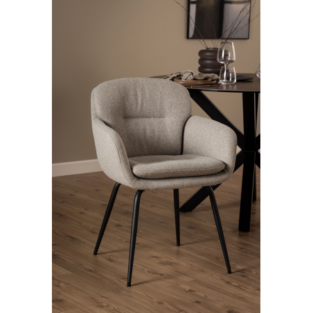 Pohodlná, čalouněná jídelní stolička Runa. Stolička je čalouněná látkou chenille a má štíhlou černou kovovou základnu. Zaoblený design dodává stoličce měkký a luxusní vzhled.