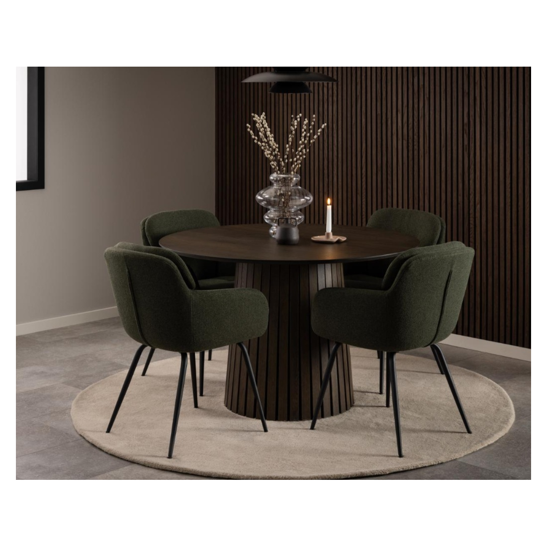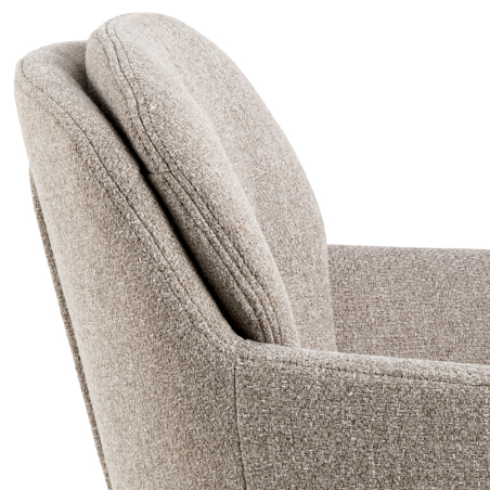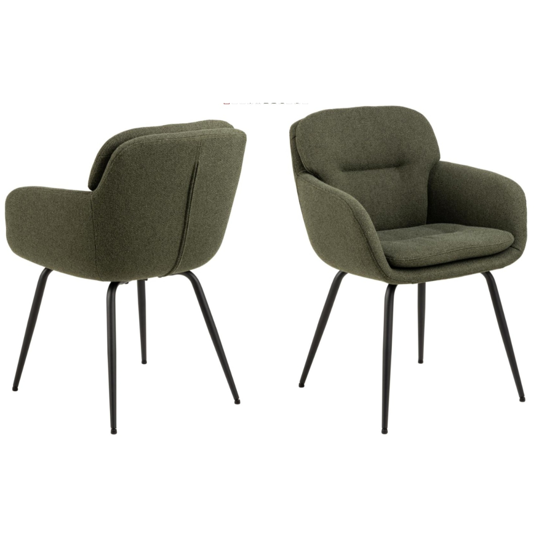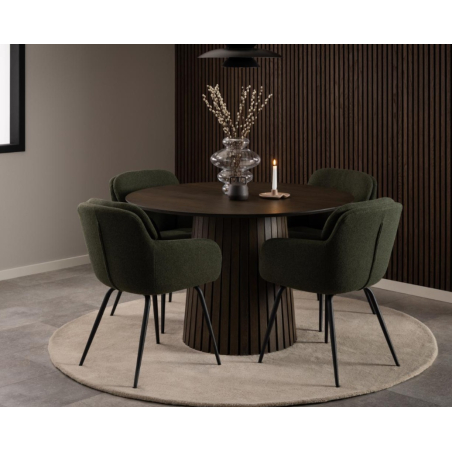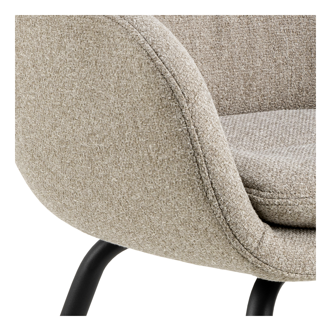 Pohodlná, čalouněná jídelní stolička Runa. Stolička je čalouněná látkou chenille a má štíhlou černou kovovou základnu. Zaoblený design dodává stoličce měkký a luxusní vzhled.