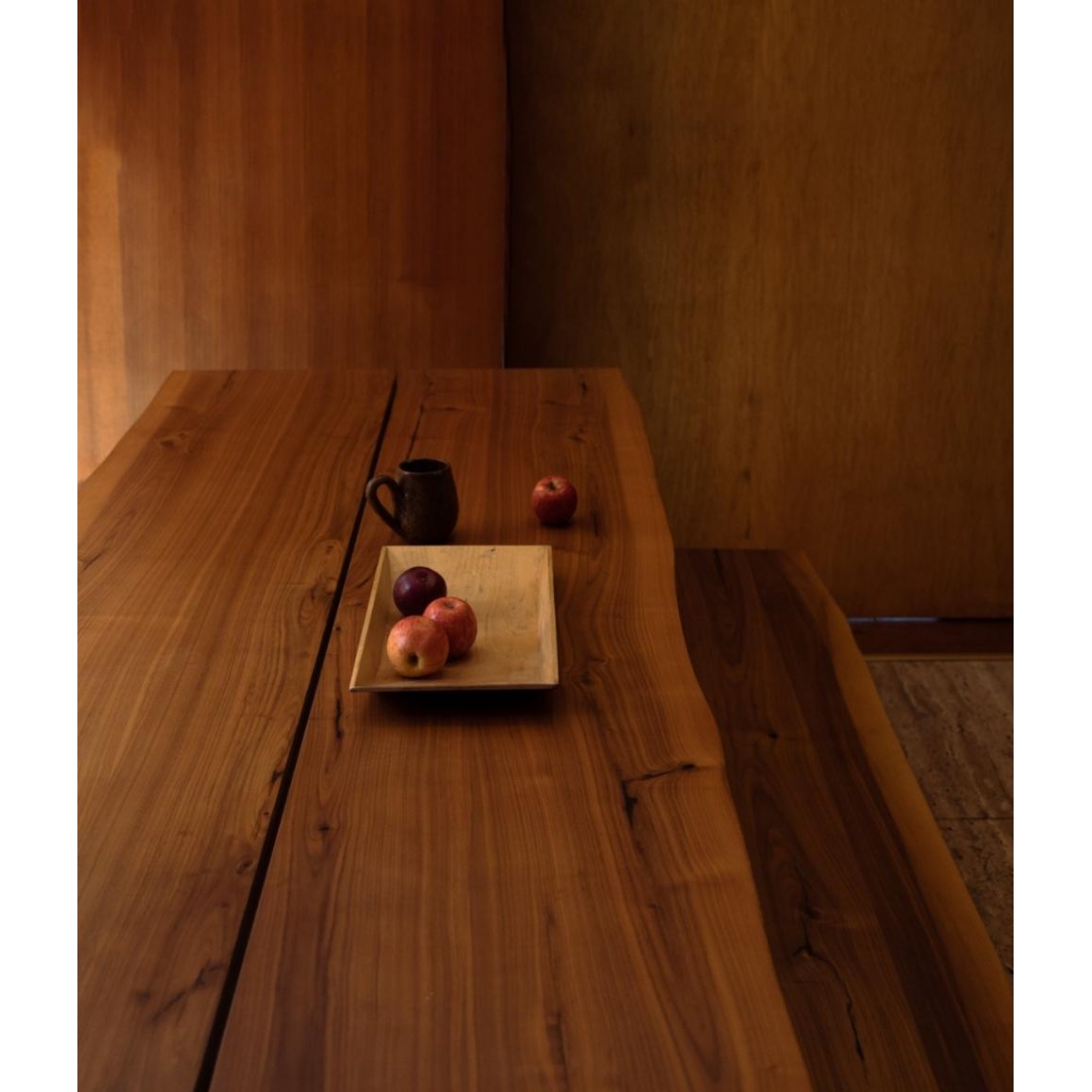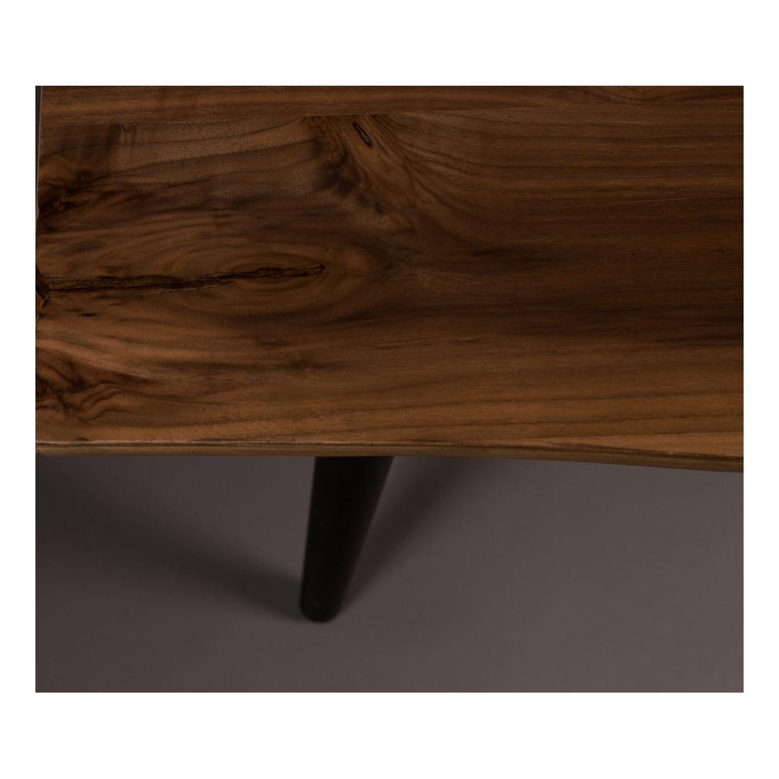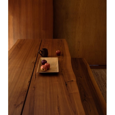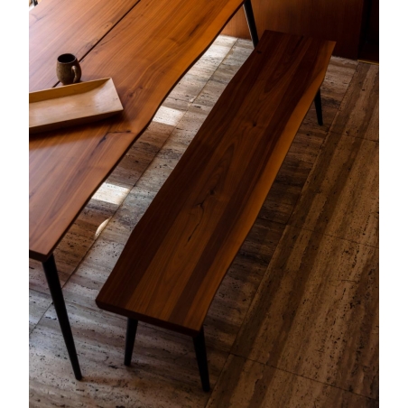 Tento stůl a lavice mají dřevěnou stolovou desku a sedátko s drsnými hranami jako kmen stromu. Přesto je design lehký a elegantní díky štíhlým ocelovým nohám. Deska stolu a sedák z MDF s ořechovou dýhou. Štíhlé nohy z oceli s práškovým nástřikem. Lehký a elegantní design, který se hodí ke každému stylu bydlení.