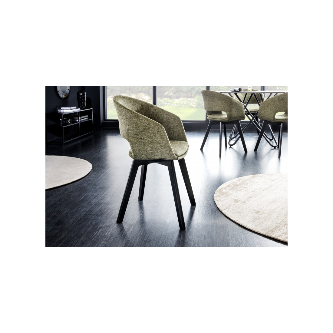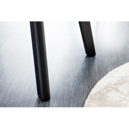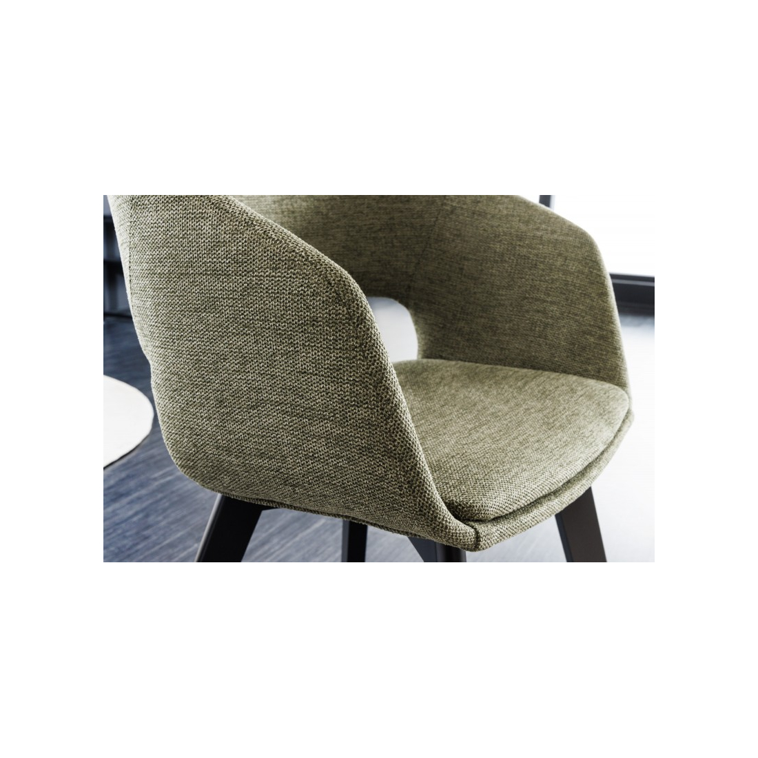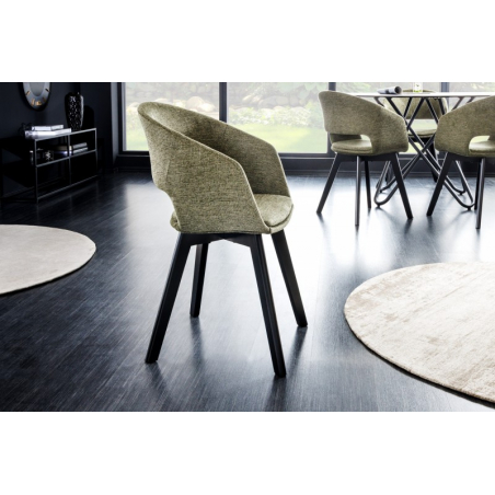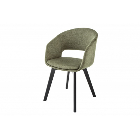 Pohodlná židle čalouněná v látce s vykrojenou zádí. Nohy z masivního bukového dřeva.