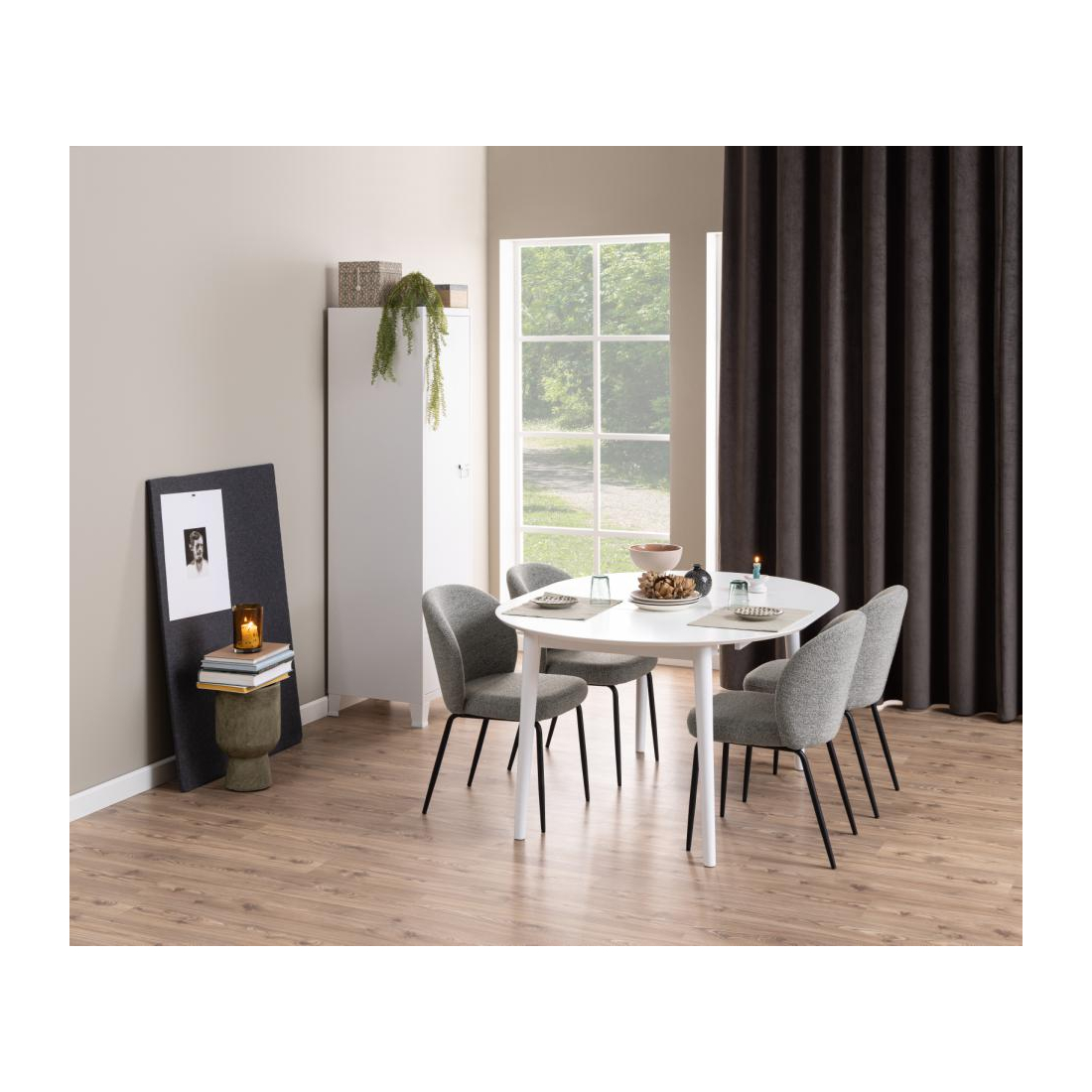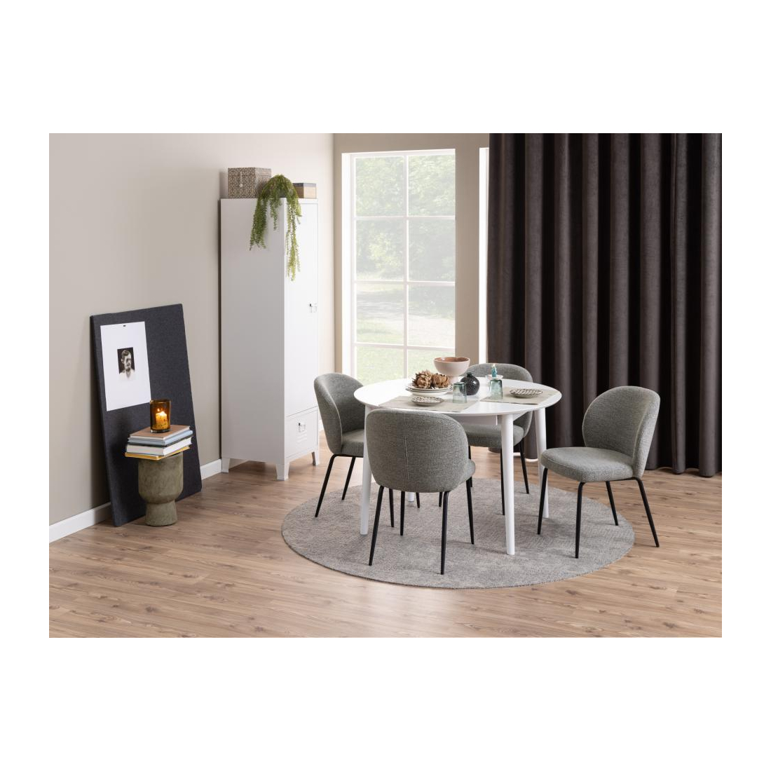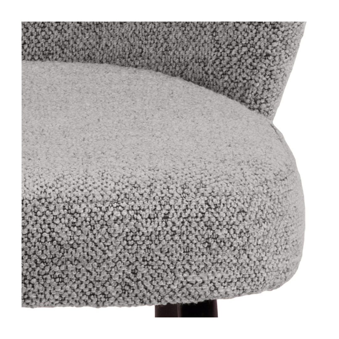 Jídelní otočná židle Pippa čalouněná béžovou buklé látkou s kadeřavou strukturou nebo hladkou šedou látkou se základnou z černého matného kovu. Speciální příležitosti nebo každodenní stolování, tato jídelní židle dokáže obojí. Díky funkci otáčení není třeba vstávat ani otáčet židli.