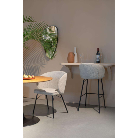 Designová barová židle ve třech barvách s látkou v bouclé s černou kovovou podnoží.