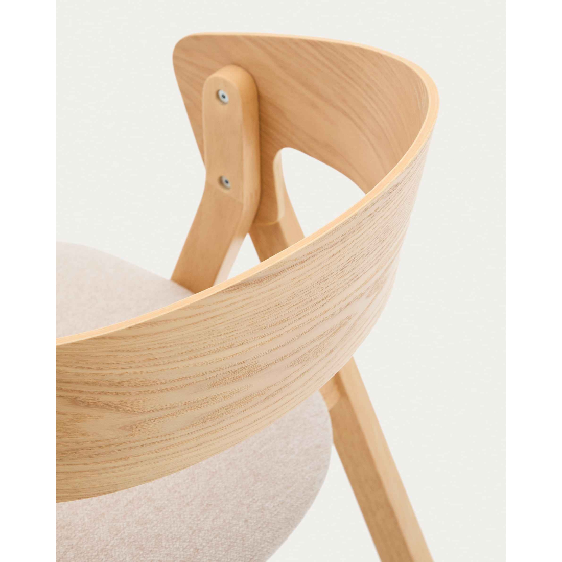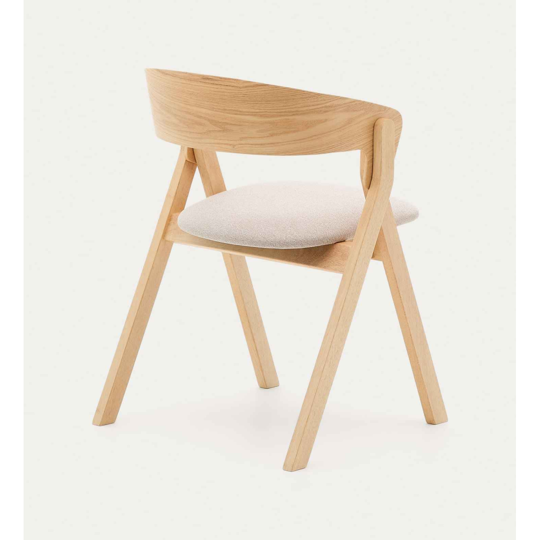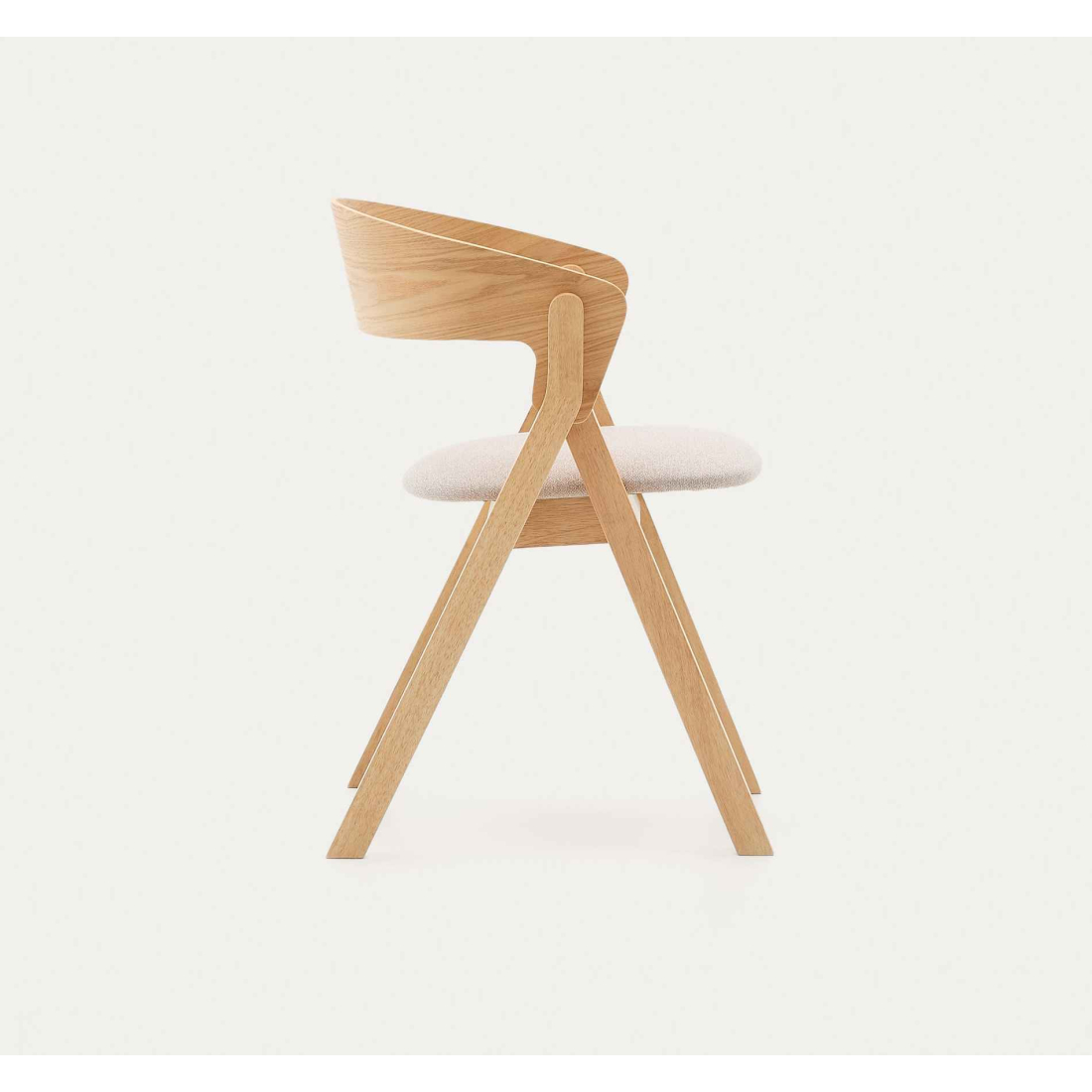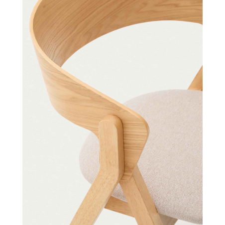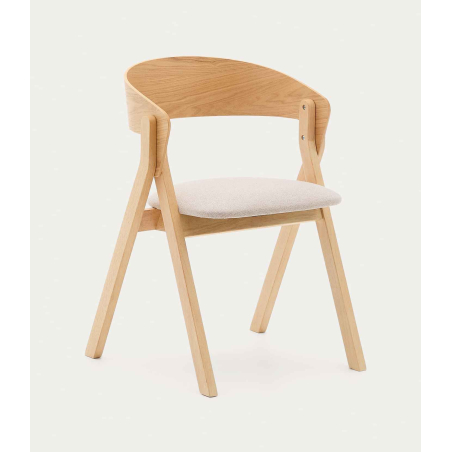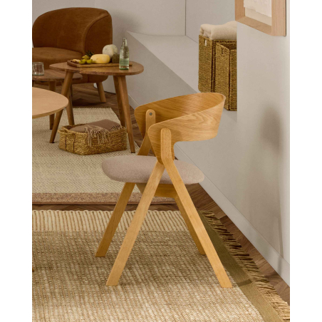 Pohodlná židle čalouněná v látce se zakřivenou zádí z dubové dýhy. Čistý severský design. Nohy z masivního dřeva v dubovém odstínu.