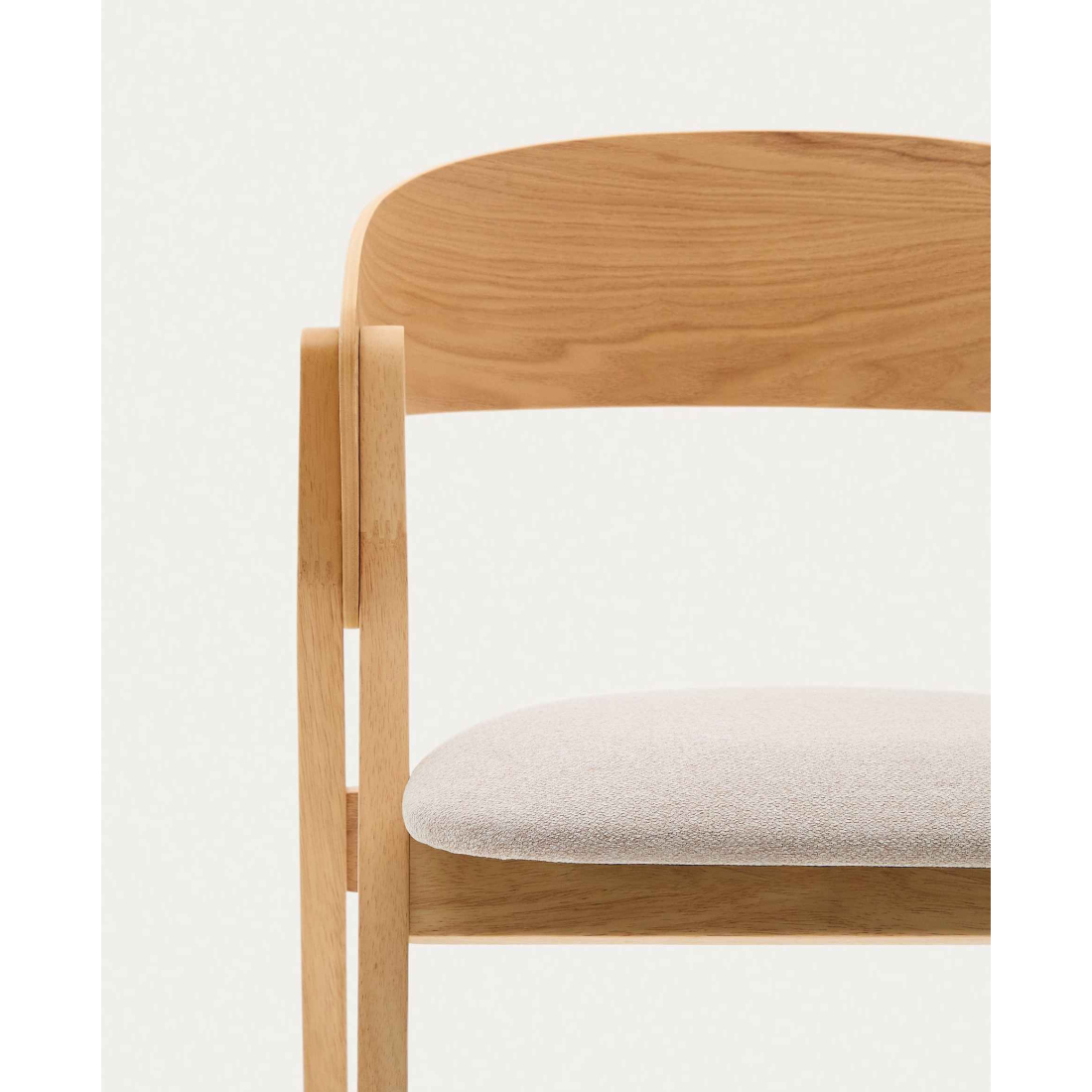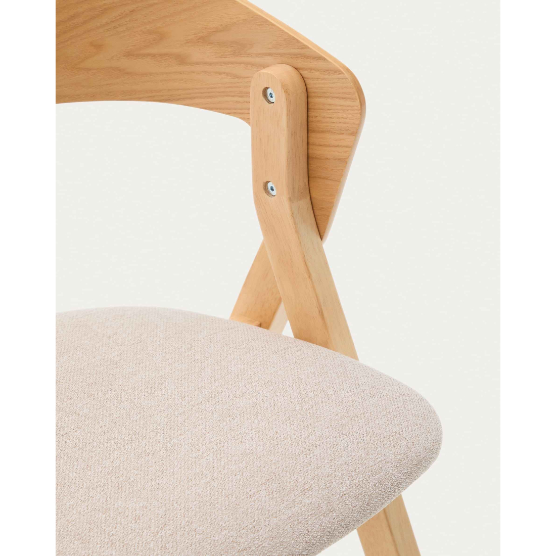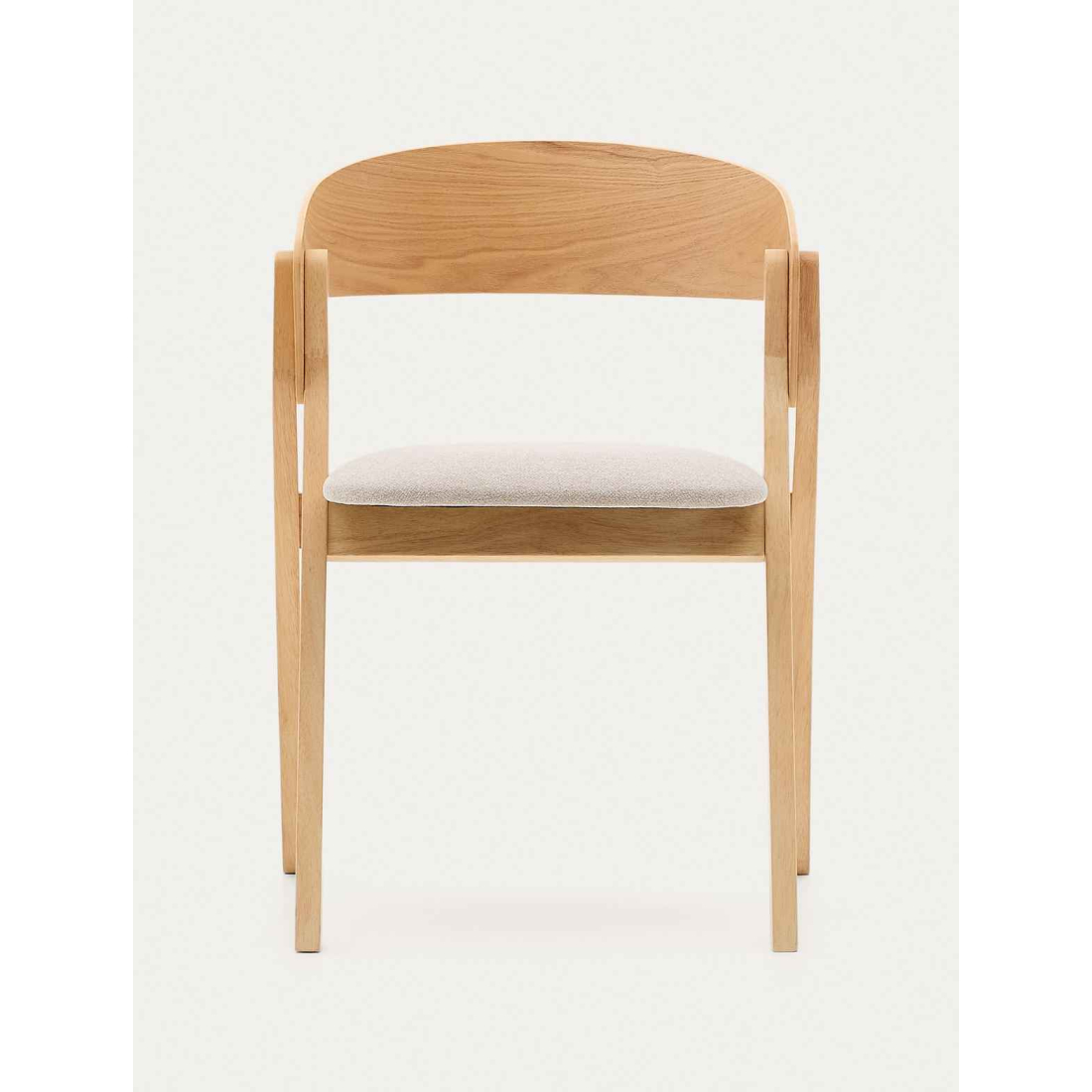 Pohodlná židle čalouněná v látce se zakřivenou zádí z dubové dýhy. Čistý severský design. Nohy z masivního dřeva v dubovém odstínu.